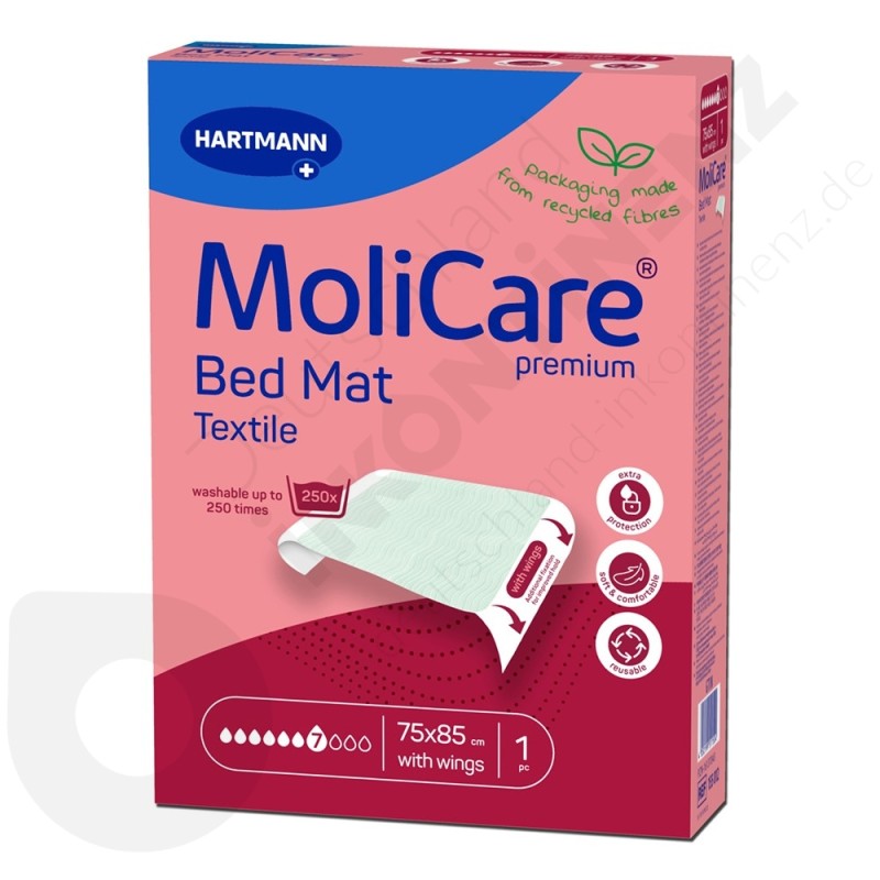 Die Schutzeinlage Molicare Bed Mat Textile 7 Tropfen - 75 x 185 cm ist eine Einweg-Krankenunterlage der Marke Hartmann, die verwendet wird, um Betten, Couchs und Stühle zu schützen.