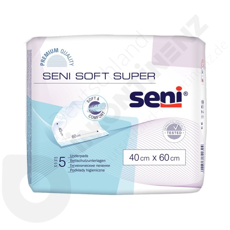 Die Schutzeinlage Seni Soft Super ist eine Einweg-Krankenunterlage der Marke Seni, die verwendet wird, um Betten, Couchs und Stühle zu schützen.
