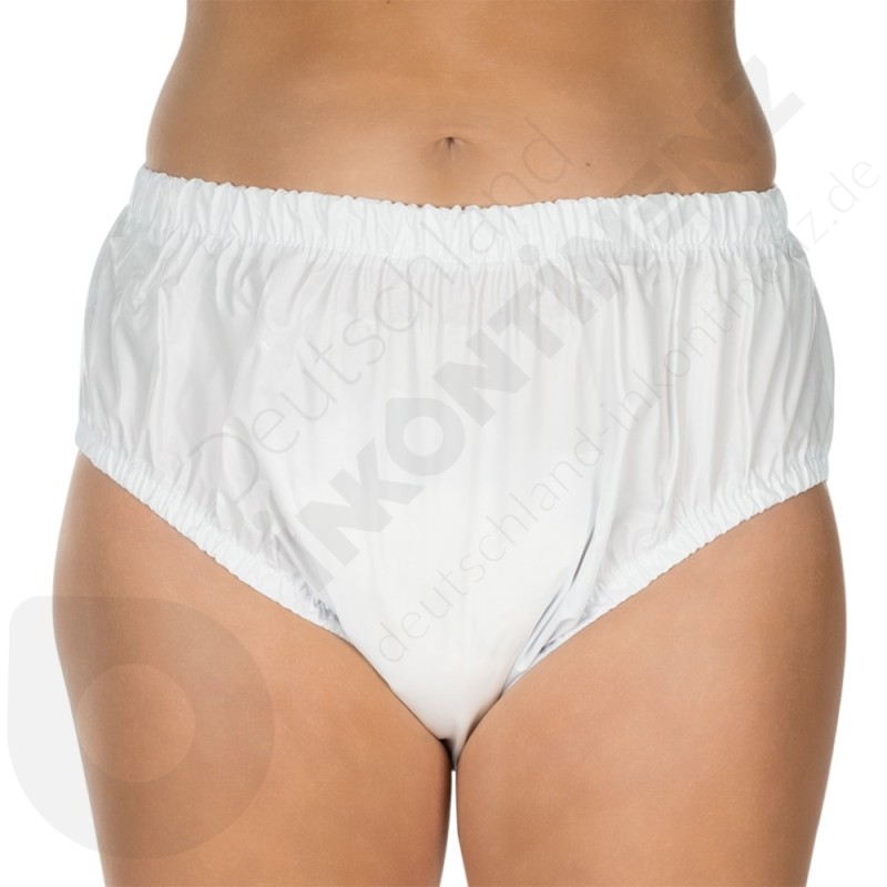 - Bringen Sie die Plastikunterhose über Ihrer üblichen Schutzeinlage (Inkontinenz Pants, Windelhosen, Anatomische Vorlagen...) an;