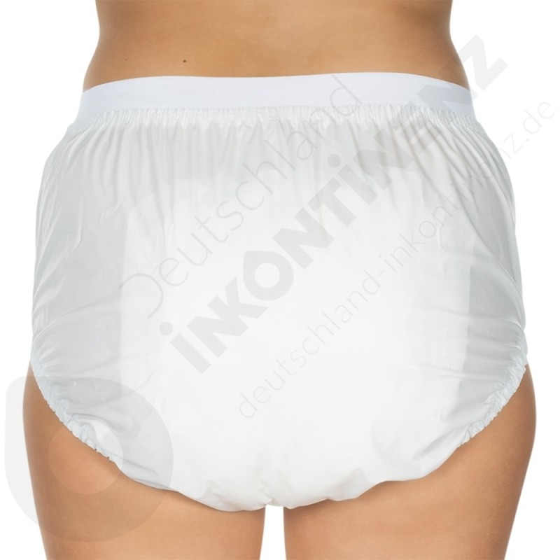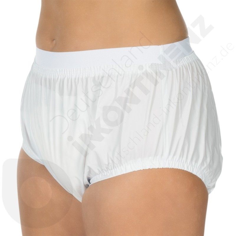 - Bringen Sie die Plastikunterhose über Ihrer üblichen Schutzeinlage (Inkontinenz Pants, Windelhosen, Anatomische Vorlagen...) an;