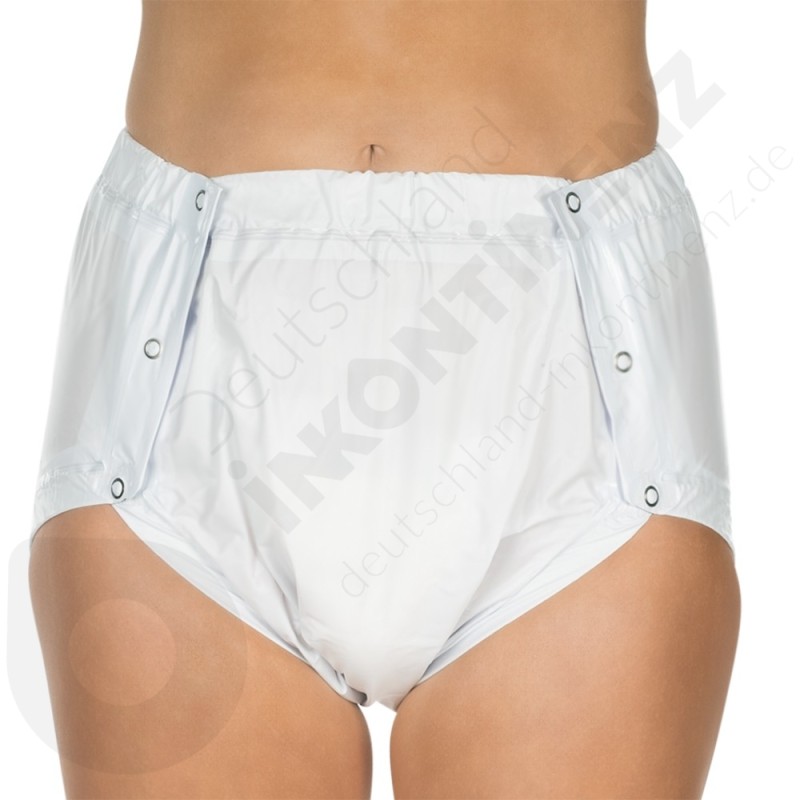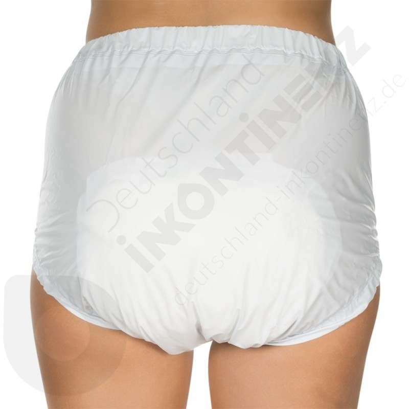 - Bringen Sie die Plastikunterhose über Ihrer üblichen Schutzeinlage (Inkontinenz Pants, Windelhosen, Anatomische Vorlagen...) an;