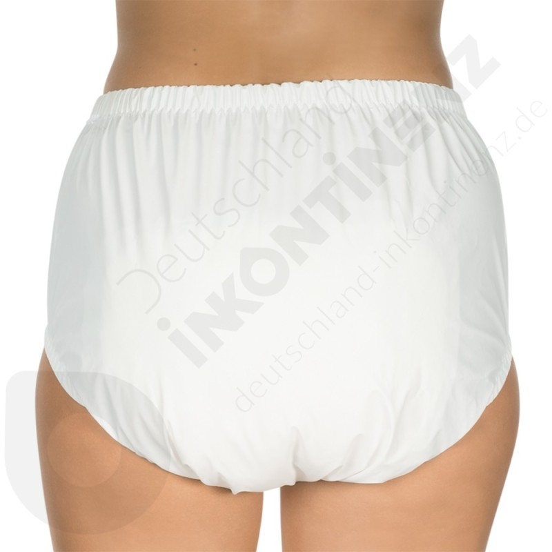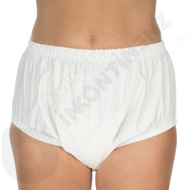 - Bringen Sie die Plastikunterhose über Ihrer üblichen Schutzeinlage (Inkontinenz Pants, Windelhosen, Anatomische Vorlagen...) an;