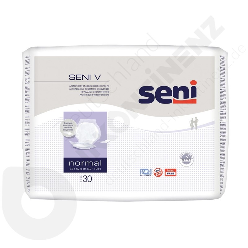 Die Schutzeinlage Seni V Normal ist eine rechteckige durchlässige Windeleinlage der Marke Seni, die als zusätzliches Aufnahmehilfsmittel verwendet wird; das heißt, dass sie nicht alleine verwendet werden kann. Sie muss zur Erhöhung der Saugfähigkeit in einen anderen Schutz eingelegt werden. Seni V Normal anatomisch geformte, durchgehende Windeln sind für spezielle Anwendungen konzipiert. Sie wurden als spezieller Schutz für Menschen entwickelt, die z. B. an Stuhlinkontinenz leiden.