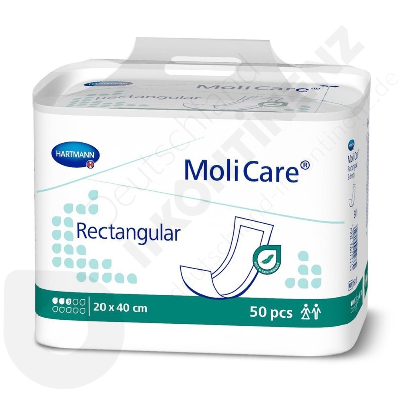 Die Schutzeinlage Molicare Rectangular 3 Tropfen ist eine rechteckige nicht flüssigkeitsdurchlässig Windeleinlage der Marke Hartmann, die als zusätzliches Aufnahmehilfsmittel verwendet wird; das heißt, dass sie nicht alleine verwendet werden kann. Sie muss zur Erhöhung der Saugfähigkeit in einen anderen Schutz eingelegt werden.